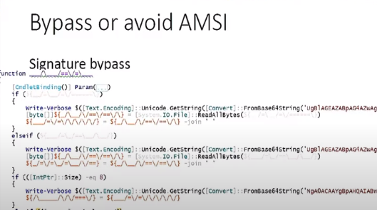 발표자들은 AMSI를 회피할 수 있는 3가지 방법인 Poershell Version 2를 사용(기본 Windows 10에 없는 .Net 3.0 필요), Signature bypass(효과가 제한), AMSI 비활성화를 제안했다. AMSI를 회피하기 위해 Signature bypass 방법은 아래와 같이 난독화를 통해 수행한 결과, AMSI에 탐지되지 않았다고 한다. (결국에는 Signature Detection이라고 생각한다고 의견을 전달함)