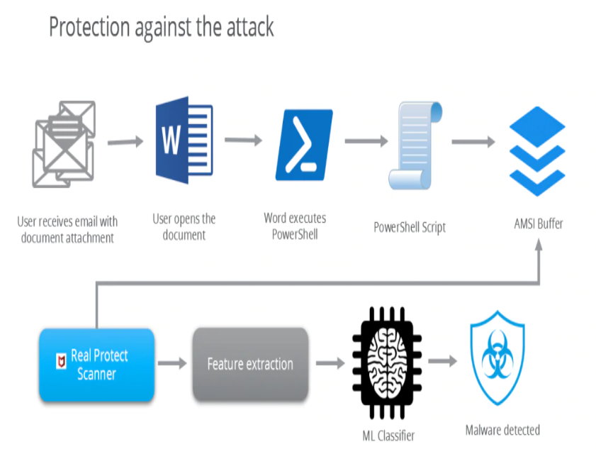 MacAfee에서 공개한 Fileless Malware에 대한 공격에 대한 전략은 아래와 같았으며, Word에서 수행하는 Powershell을 실행하고, AMSI Buffer에 저장된 파워쉘 코드를 MacAfee 스캐너가 탐지하여 Feature를 추출하고 ML을 이용해 분류하여 최종적으로 Zero-Day- Powershell 위협을 탐지할 수 있었다고 전했다.