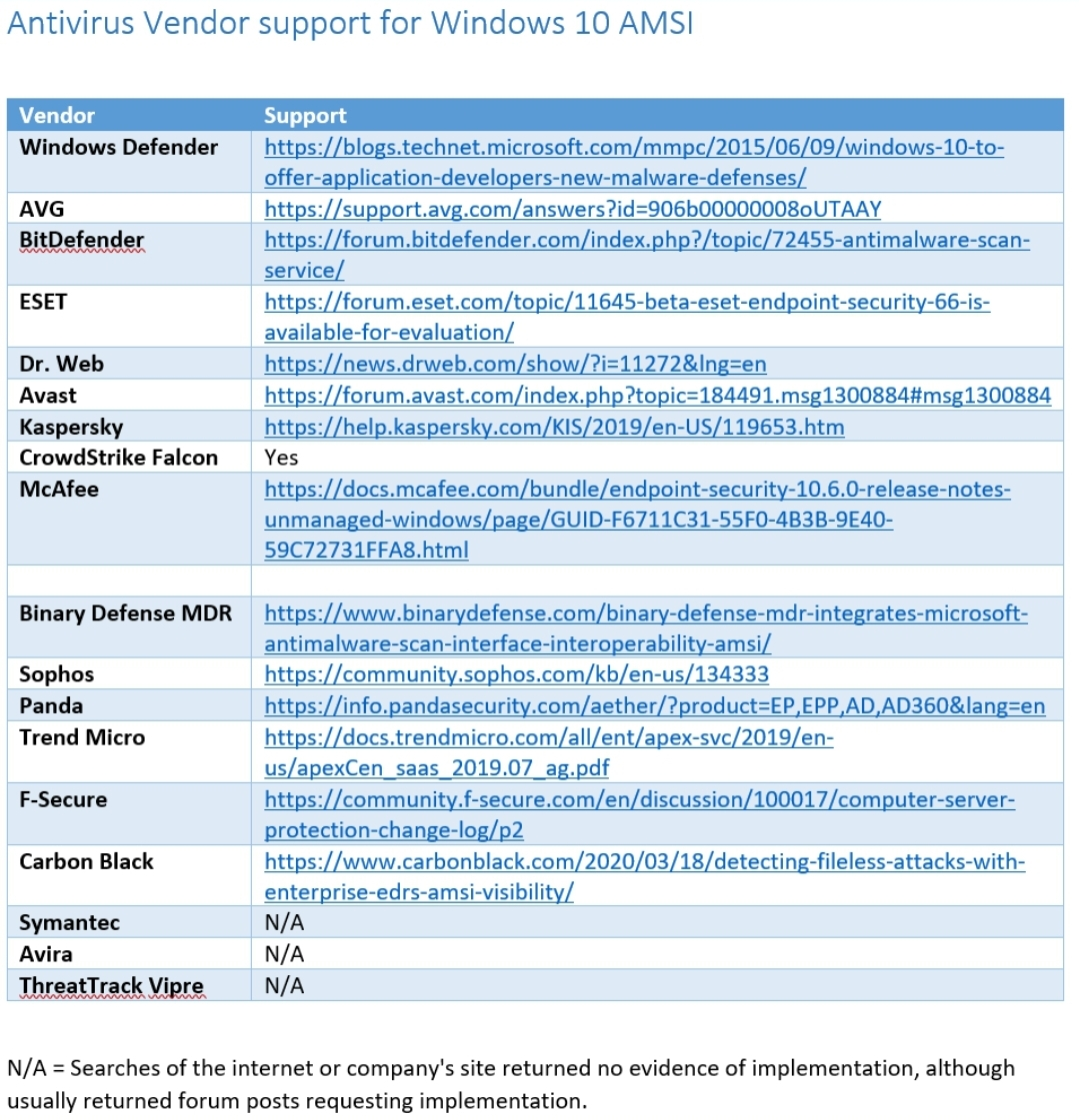 Twitter @Lee_Holmes에 따르면 20년 3월 말 기준으로 AMSI를 지원하는 Antivirus Vendor가 아래와 같았다. Windows Defender, AVG, BitDefender, ESET 등 15개 보안업체가 이를 점차 활용하고 있으며, Fileless 공격에 대응하기 위해 앞으로도 계속적으로 추가될 것으로 보인다. (2016년 7월 21일 기준 2개 벤더(Windows Defender, AVG)만 사용했지만 현재 15개로 점진적으로 해당 기술을 사용하는 업체가 증가하고 있는 추세)