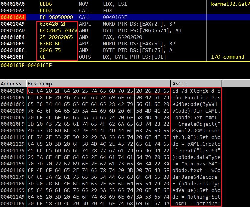 참고로, (Figure 10) 0x4010A4 주소의 CALL 0040163F는 system API 함수를 호출하는 함수입니다. 바로 밑의 0x4010A9 주소는 VBScript가 작성된 것으로, system 함수의 인자 값으로 동작됩니다.