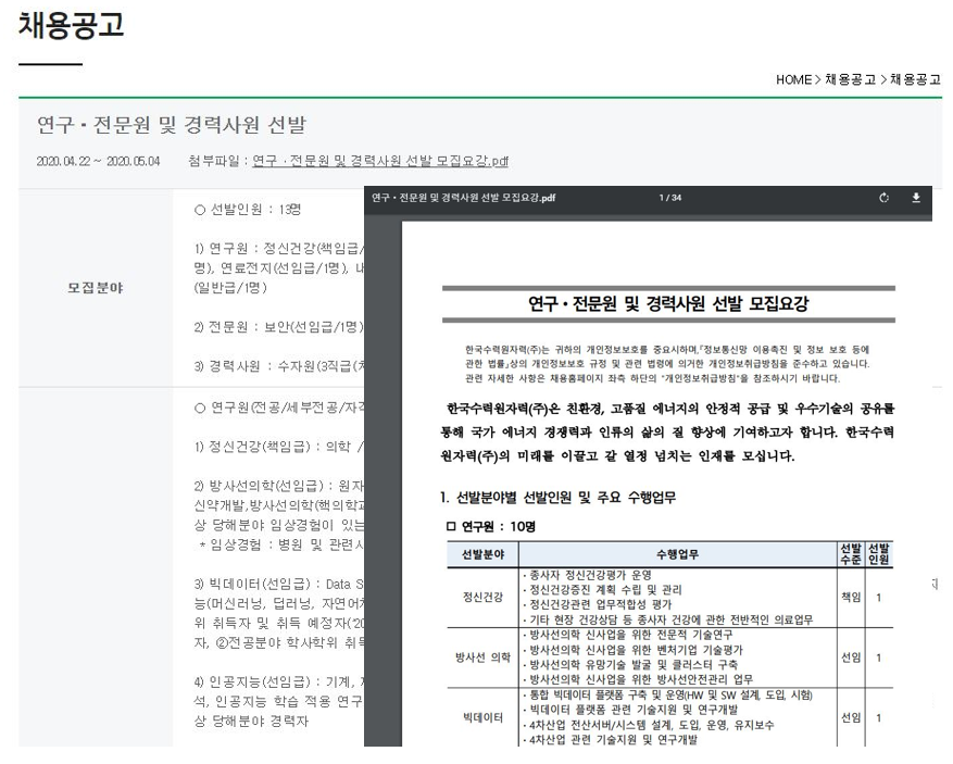 공격자는 실제 한국수력원자력 상반기 2020 채용공고 문서(Figure 2)와 유사하게 작성(Figure 3)을 했으며, 일부 내용은 조금 다른 것을 확인했습니다. 한수원은 2014년 특정 공격그룹(언론은 라자루스라고 칭함)에 의해 공격을 당한 이력이 있었기 때문에 해당 공격이 화제가 되었던 것 같습니다.