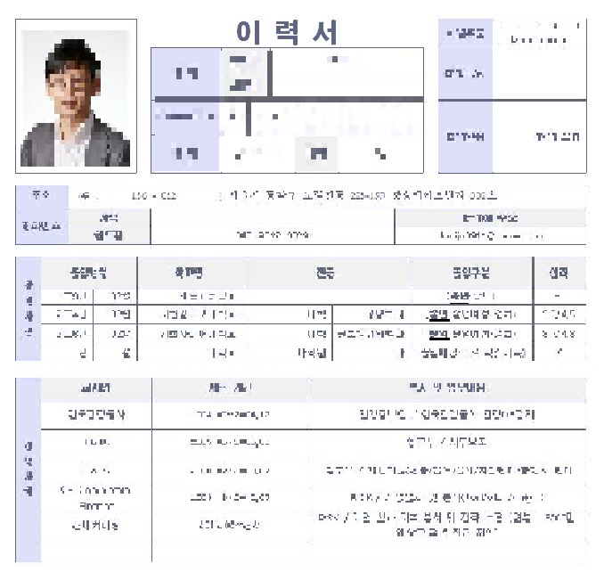 (Figure 5) 유포된 한글파일 내용에는 이력서라는 내용이며, 개인신상정보가 담겨있어 모자이크를 수행했습니다.