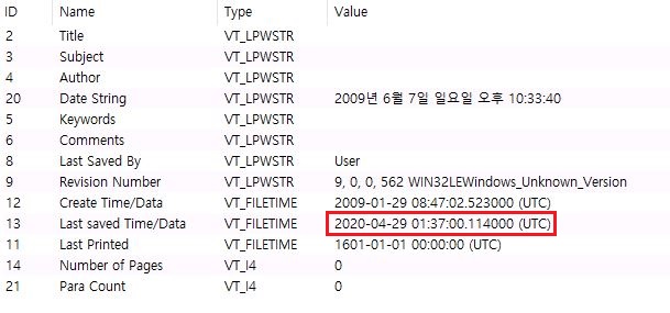 (Figure 4) 마지막 작성된 시각은 2020년 4월 29일 1시 37분경에 작성된 것으로 확인됐으며, 이전 공격[1]보다 약 9분 후 만들어진 것으로 보입니다.