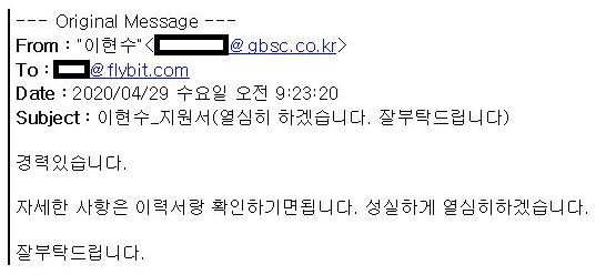 (Figure 1)은 공격자가 (Figure 2) 국내 암호화폐 거래소(flybit)에 전송한 메일 내용입니다. (Figure 3) 국내 "(주)GBSC" 회사메일로 "이현수"라는 발신인이 flybit 측에 입사지원하는 내용이며, GBSC는 보호필름, 전자재료를 생산하는 회사인 것으로 확인됐습니다. 임의로 만들어진 계정일 것으로 추정되며, 공격자가 GBSC 사이트를 이용한 것으로 보아 해당 사이트가 공격자의 타겟이 됐을 수도 있겠다는 생각이 들었습니다.