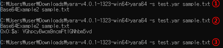 - YARA의 모든 문자열은 private로 표시될 수 있으며, 이는 YARA의 출력에 포함되지 않는다. 커맨드라인으로 -s 옵션을 사용하면 탐지된 스트링이 출력된다. 하지만, private을 사용하면 스트링은 출력이 안되지만 룰에 탐지되었다는 표시는 출력된다. (Figure 2)는 yara 4.0.1 버전에서 아래 룰(Base64Example2)을 테스트한 것으로, 1번은 private 키워드를 추가했을 때 나오는 출력화면, 2번은 private을 지웠을 때 나오는 화면이며, 3번은 base64, private modifier를 모두 지웠을 때 나오는 화면이다. 위에서 설명한 것과 같이 private을 적용하면 1번에서 탐지된 룰 이름은 나오지만, 탐지된 오프셋과 내용은 출력되지 않는다.